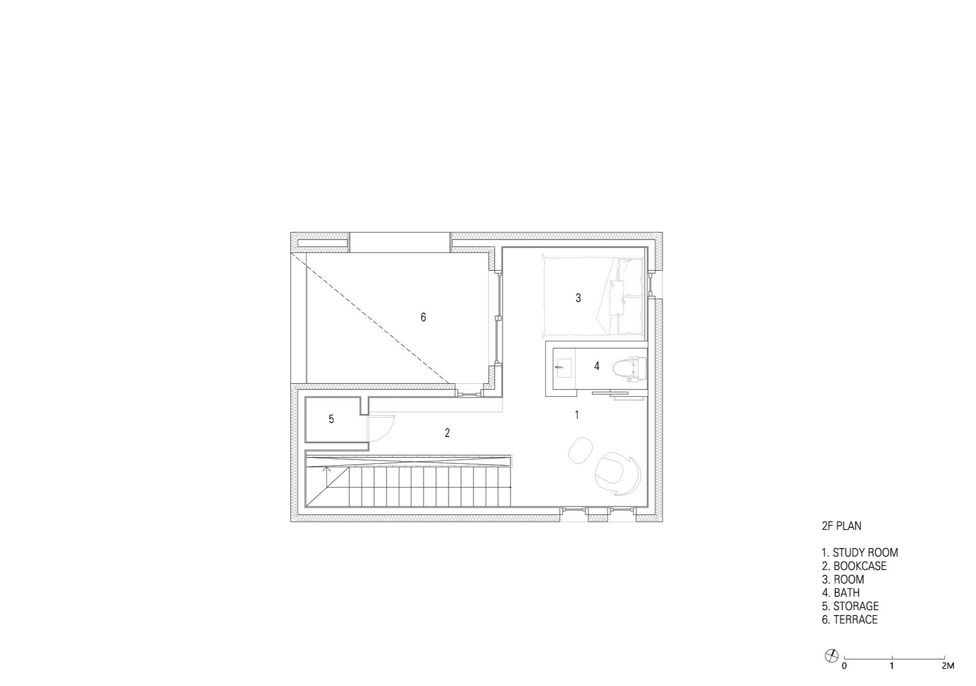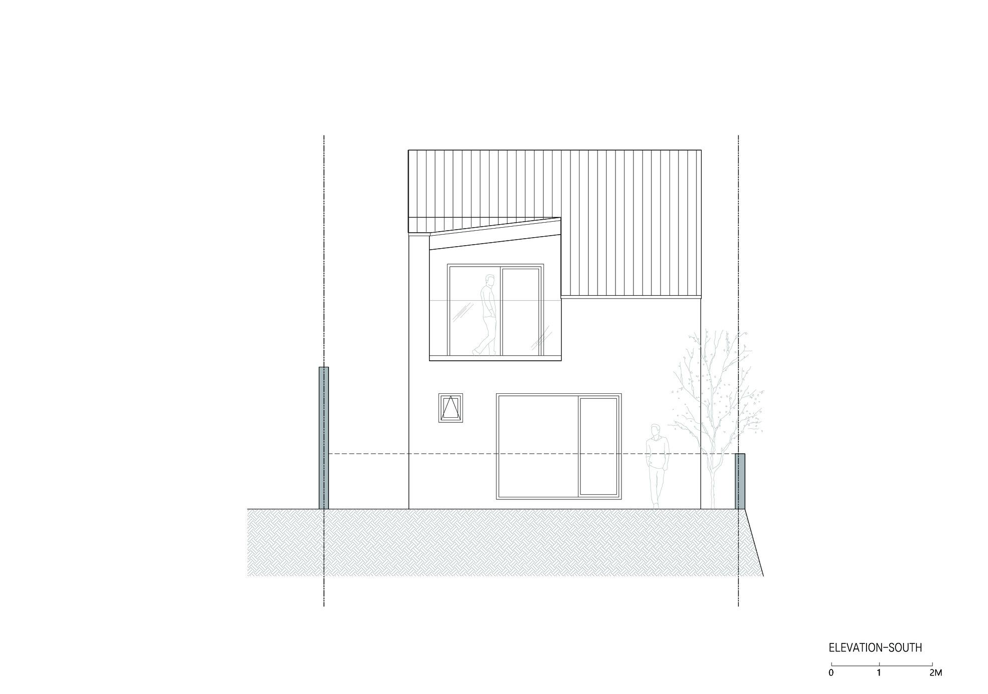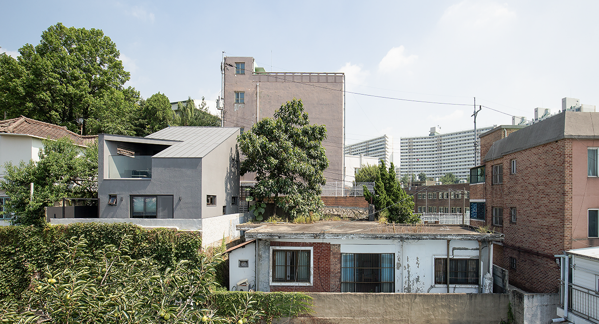 대지는 성북동 산자락에 위치한 곳으로 성북동이 한눈에 들어오는 곳이다. 좁은 도로와 높은 경사도로 인해 신축이 불가능한 여건으로 기존의 단층 조적구조의 주택을 뼈대만 남기고 구조보강을 통해 일부 증축 및 리모델링으로 진행되었다. 30평가량의 협소한 대지에서 건축법규를 적용하고 전면부의 오래된 보강토 옹벽에 의한 구조적 부분을 반영하니 1층이 15평 내외 공간만 사용할 수 있었다. 건축주의 요구사항은 최대한 프라이버시를 지켜줄 것이었고, 이에 도로에 면한 부분은 최소의 창만, 전면부는 열린 공간으로 계획되었다. 도로에서는 숨겨지고 내부는 마감재료가 그대로 드러나는 주택으로 내부 바닥은 투명 에폭시, 벽면은 시멘트 블록으로 계획되었다.