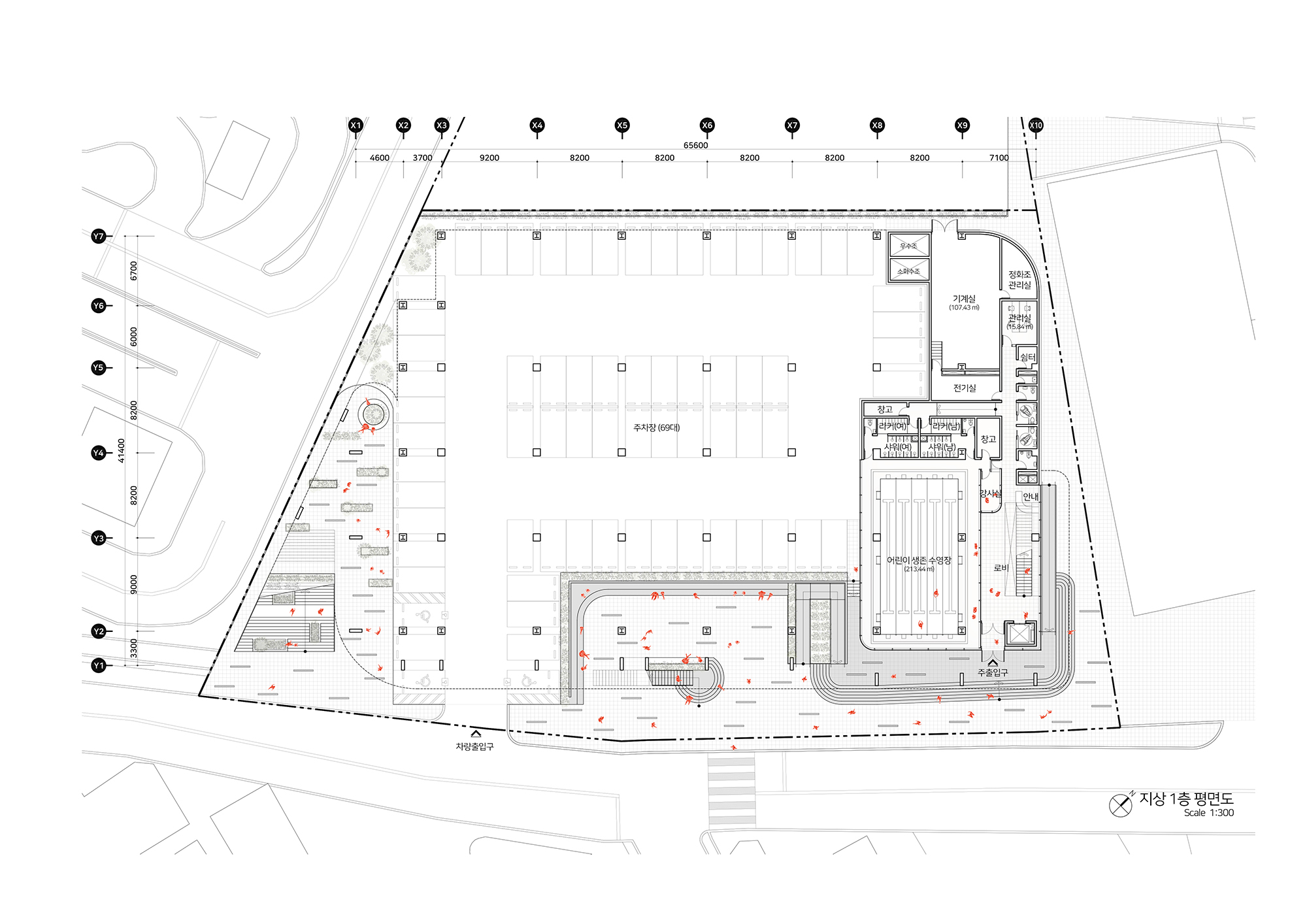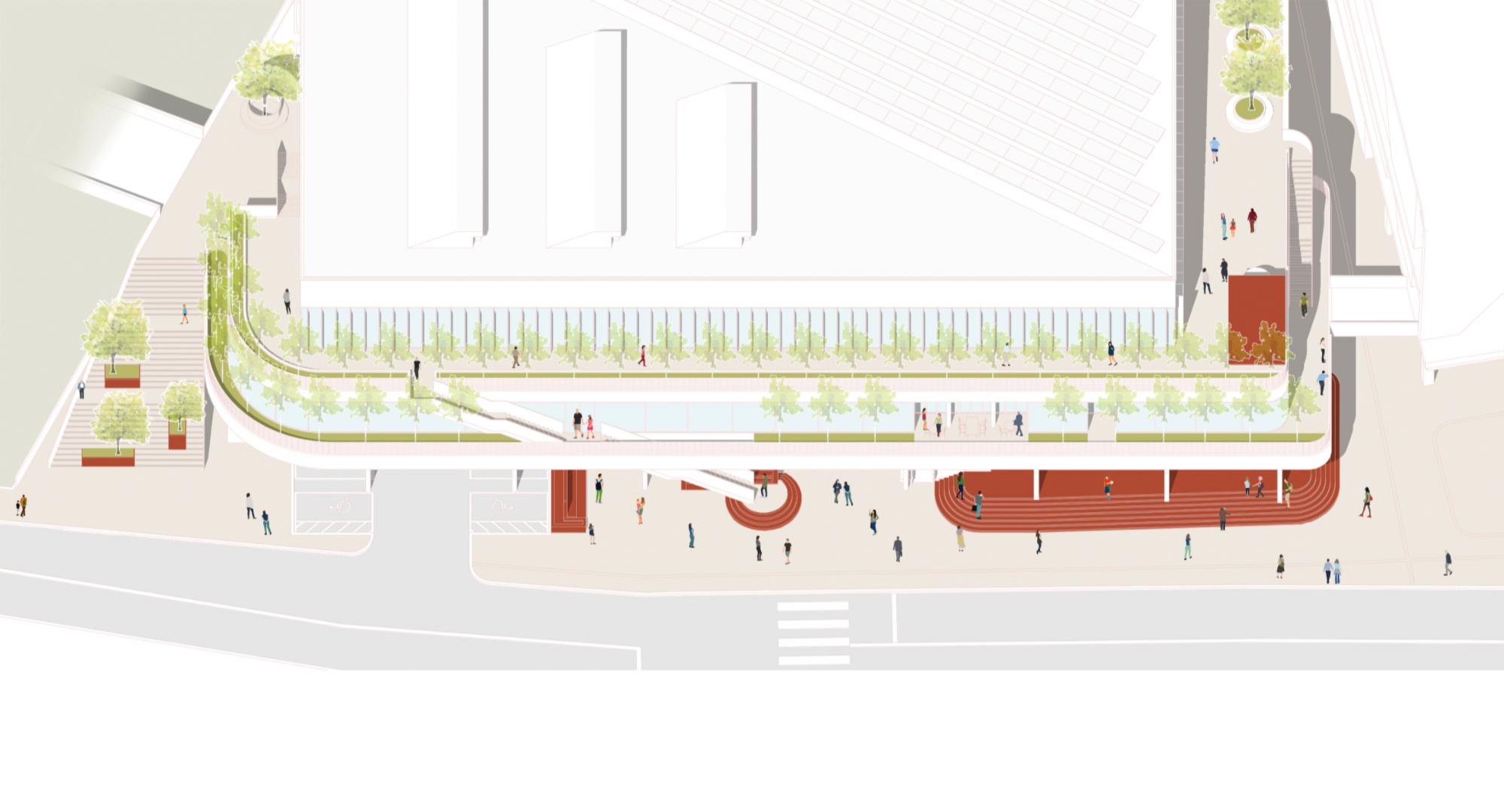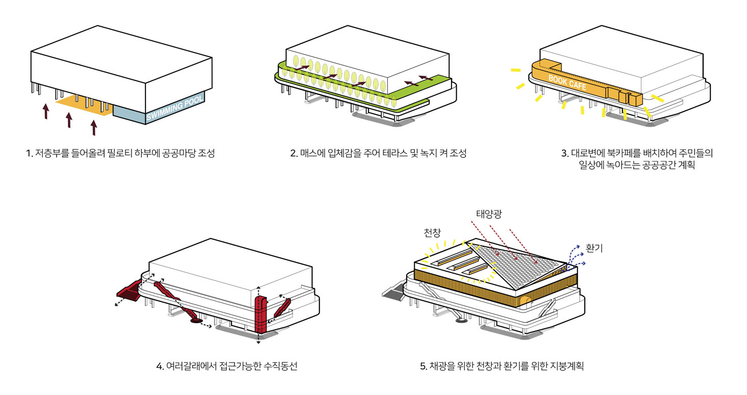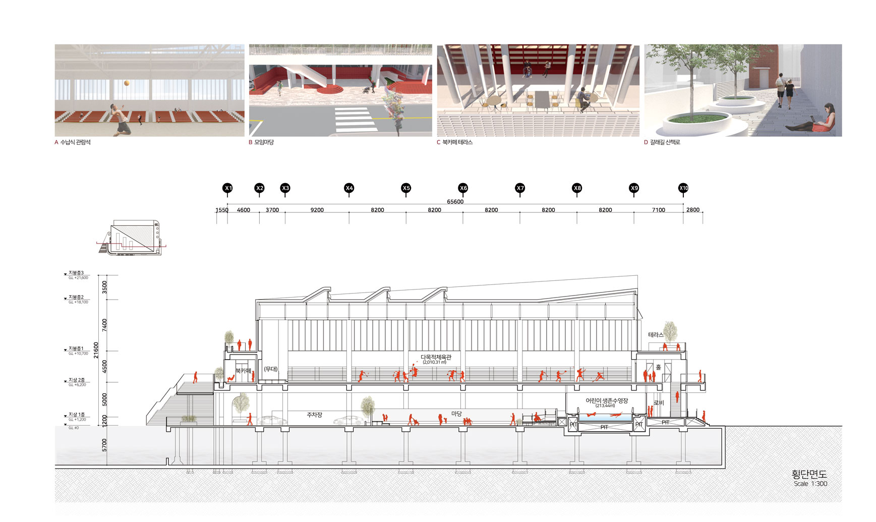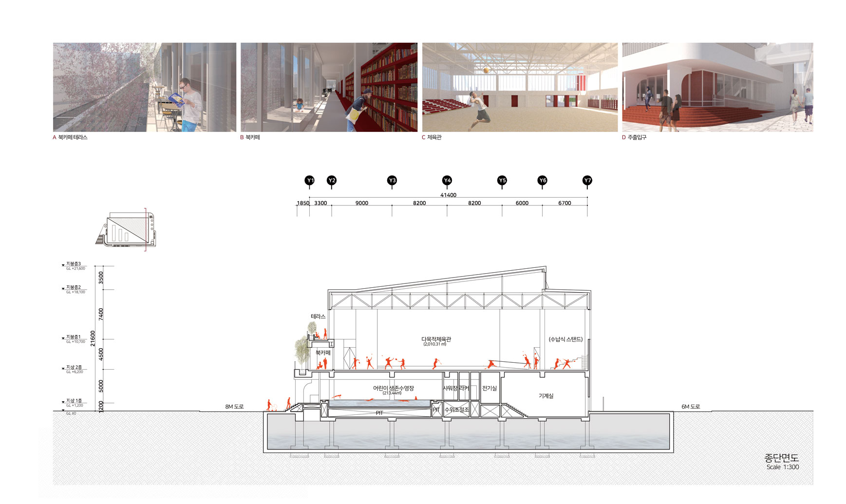 기존 차고지가 이전되면서 남게된 공간에 주민들을 위한 새로운 체육관을 계획을 하는 현상설계였다. 전면부의 좁은 보행로를 확장하고 다양한 진입동선을 만는 것이 주요 계획요소였다. 좁은 차로에 길게 접한 대지로 전면부에 카페 및 녹지공간을 풍부하게 계획하여 새로운 동네 가로를 만들어주고자 했다. 대상지를 기점으로 향후 도서관 등 새로운 공공시설이 들어서는 대상지는 기존에 인접한 수영장과 이를 연결하는 새로운 구심점으로 다양한 연결방식을 담고자했다. 좁은 가로에 면한 대규모 필지에서의 건물의 위치 및 새로운 가로 환경으로서의 입면의 역할에 등에 관해 고민할 수 있었다. 플루토건축사사에서 진행하였던 현상설계 계획안이다.