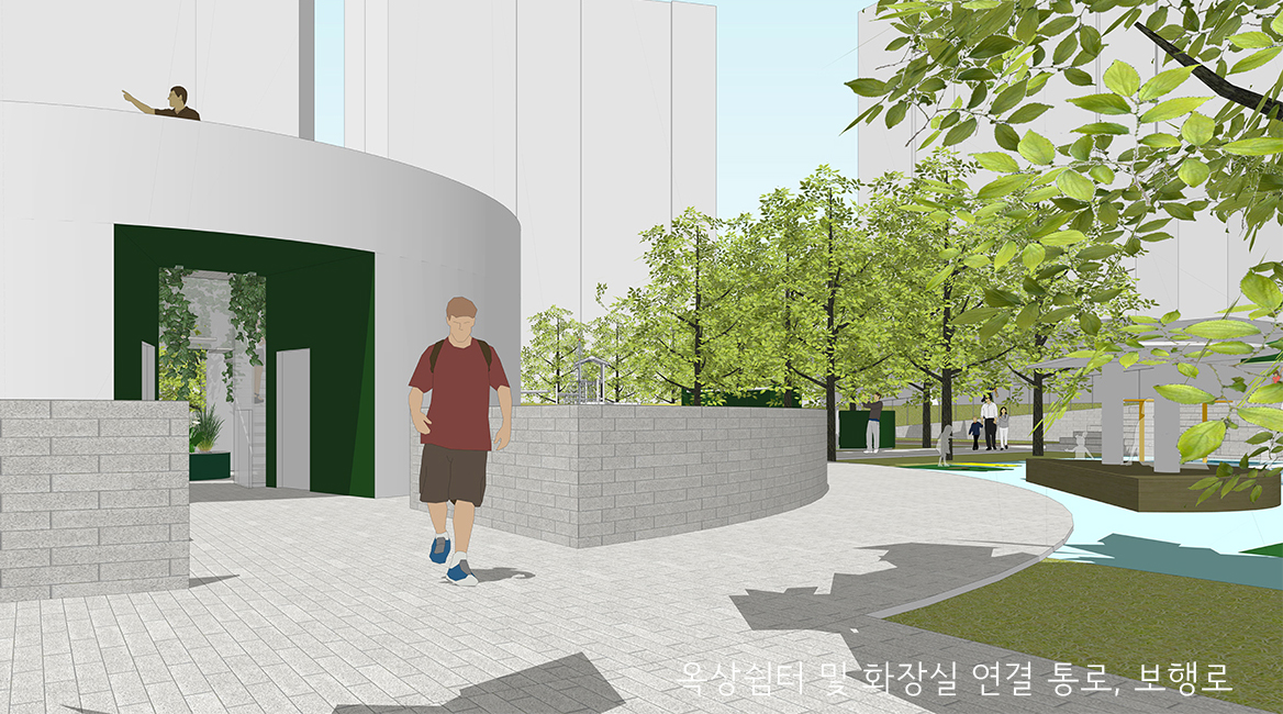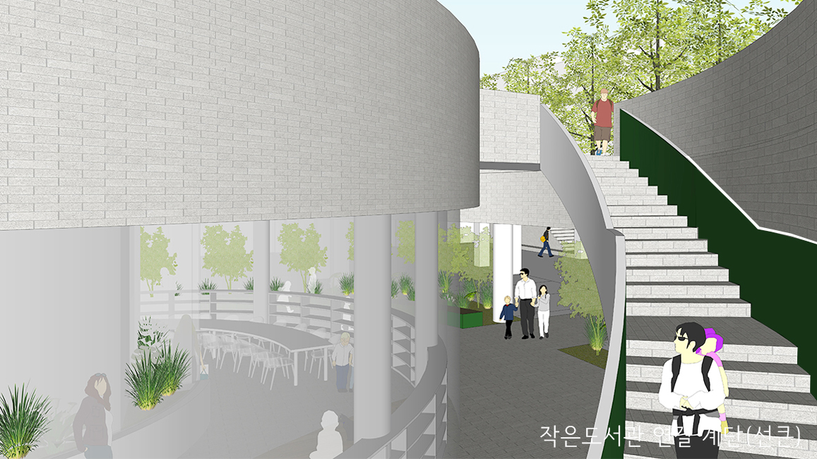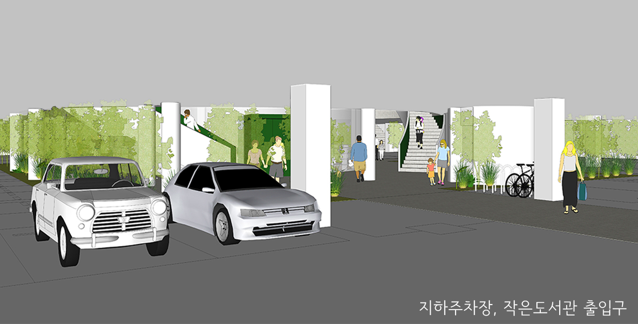 현재 주차장으로 사용되고 있는 대상지를 지하층은 주차장과 도서관, 지상층은 어린이 공원으로 계획하는 현상설계이다. 주요 지침 내용은 최적의 주차 배치, 선큰계획, 지하에 조성하는 작은 도서관, 창의적인 공원계획이다. 메인 프로그램은 어린이 공원이지만, 이러한 지침의 조건을 반영하여 대상지 중심부에 공원에서 필요한 편익시설(화장실 및 쉼터, 수직동선 등)을 배치하고 이를 중심으로 선큰 및 도서관을 계획하였다. 선큰을 통해 지하공간에 환기 및 채광을 적극적으로 고려하고 수직동선을 배치하여 주차장, 도서관, 어린이 공원이 중심부에서 상호 자유롭게 연결되도록 하였다. 지하 주차장은 중심부 공간에 도서관을 배치하여 막힌 구간이 없도록 동선계획을 하였으며, 중심부 선큰을 통해 열린 공간이 되도록 하였다. 지상부 공원은 선큰을 중심으로 놀이 테마를 배치하고 중심부를 향한 동선계획으로 이용성을 높였다. 다양한 레벨에서 진입가능한 동선계획을 하였으며, 우측 교차로 지점을 적극적으로 열어 열린 공원으로 계획하였다. 일반적인 놀이기구 중심의 공간이 아닌 공간중심, 테마 중심으로 놀이공간을 계획하였다. 이용성을 고려한 배치계획과 지상, 지하의 다른 시설들 간의 유기적 연결을 통한 하나의 공간으로 인지 되길 기대하였으며, 이를 통해 지역의 새로운 공공시설로서 기능하길 기대하였다.