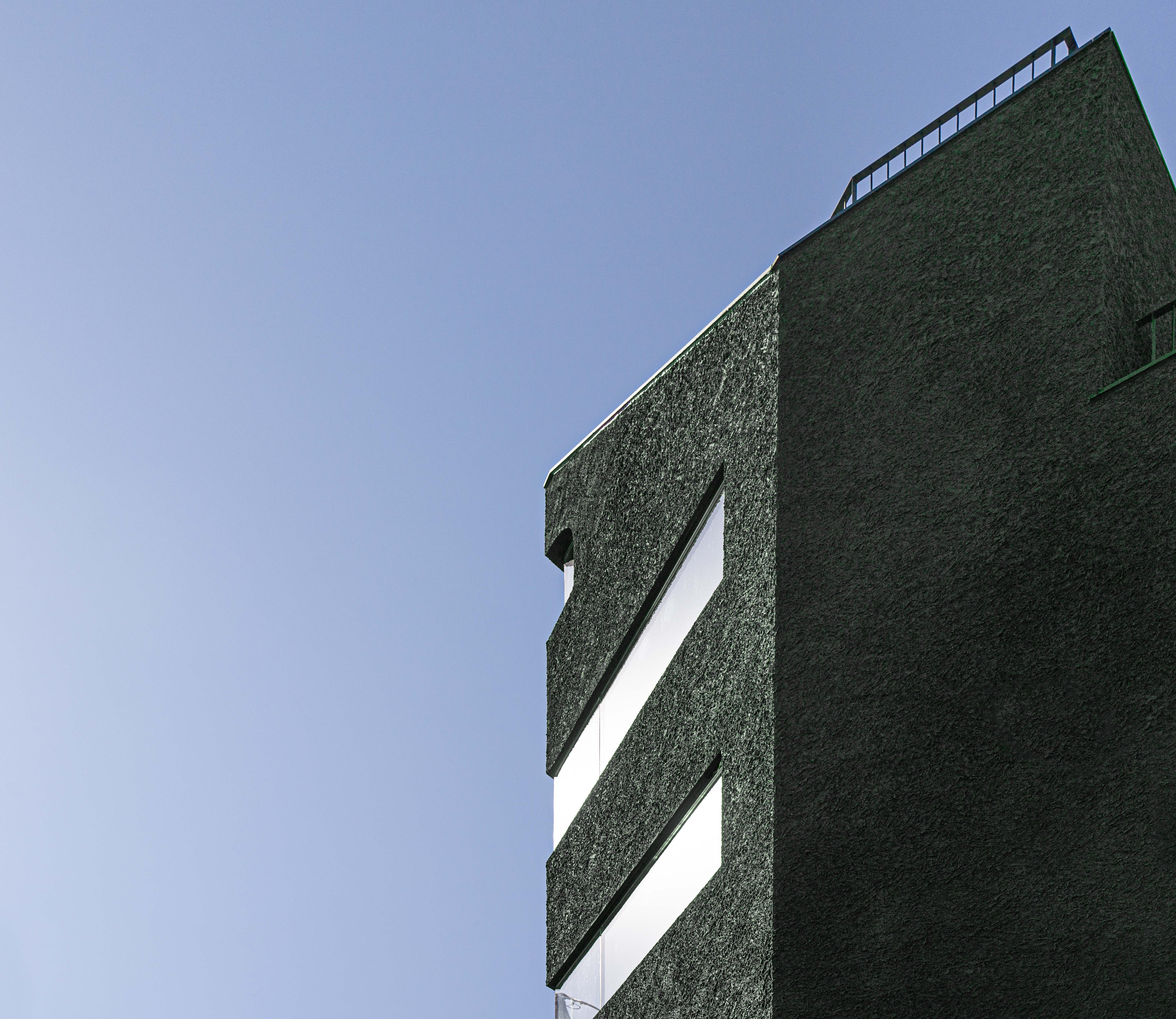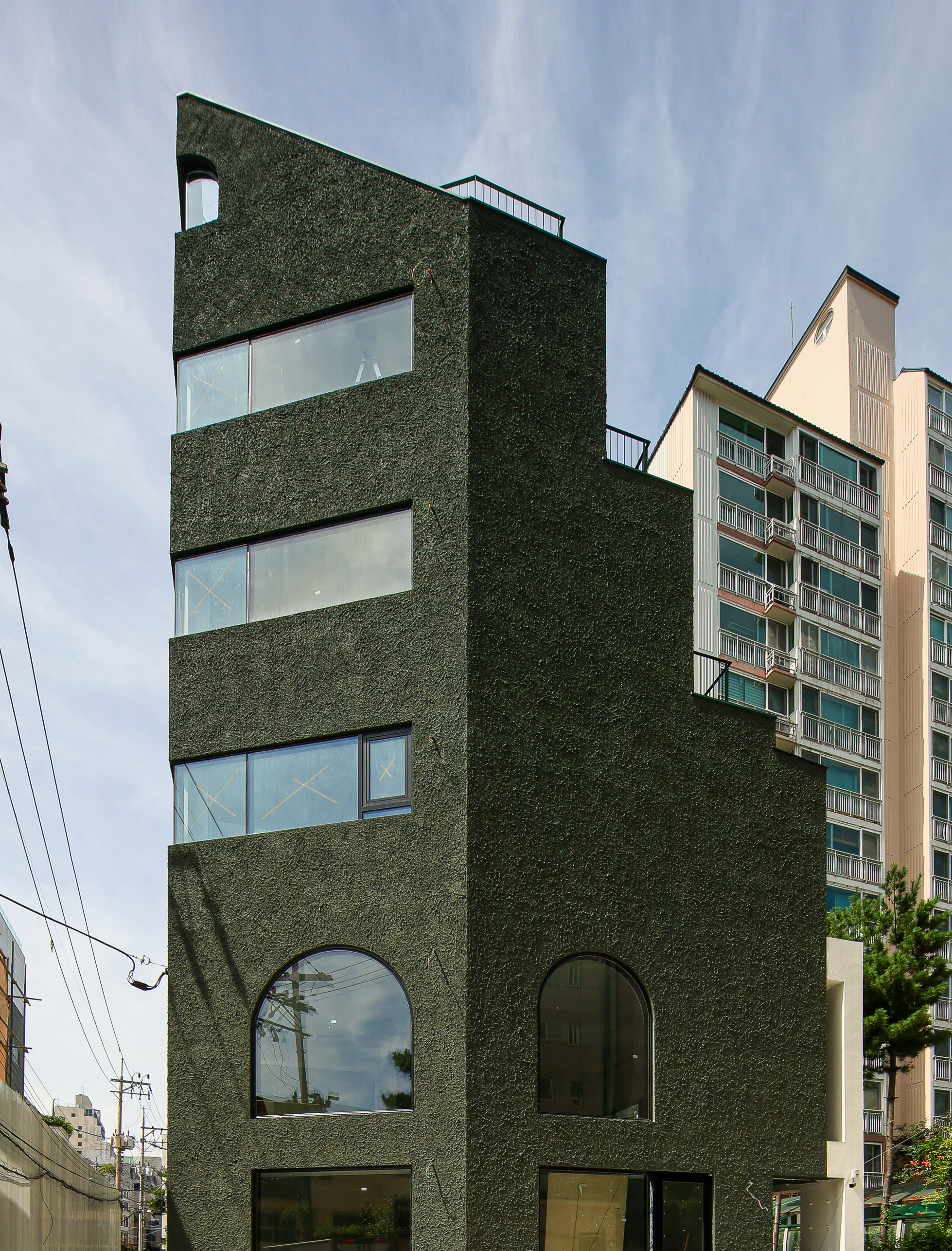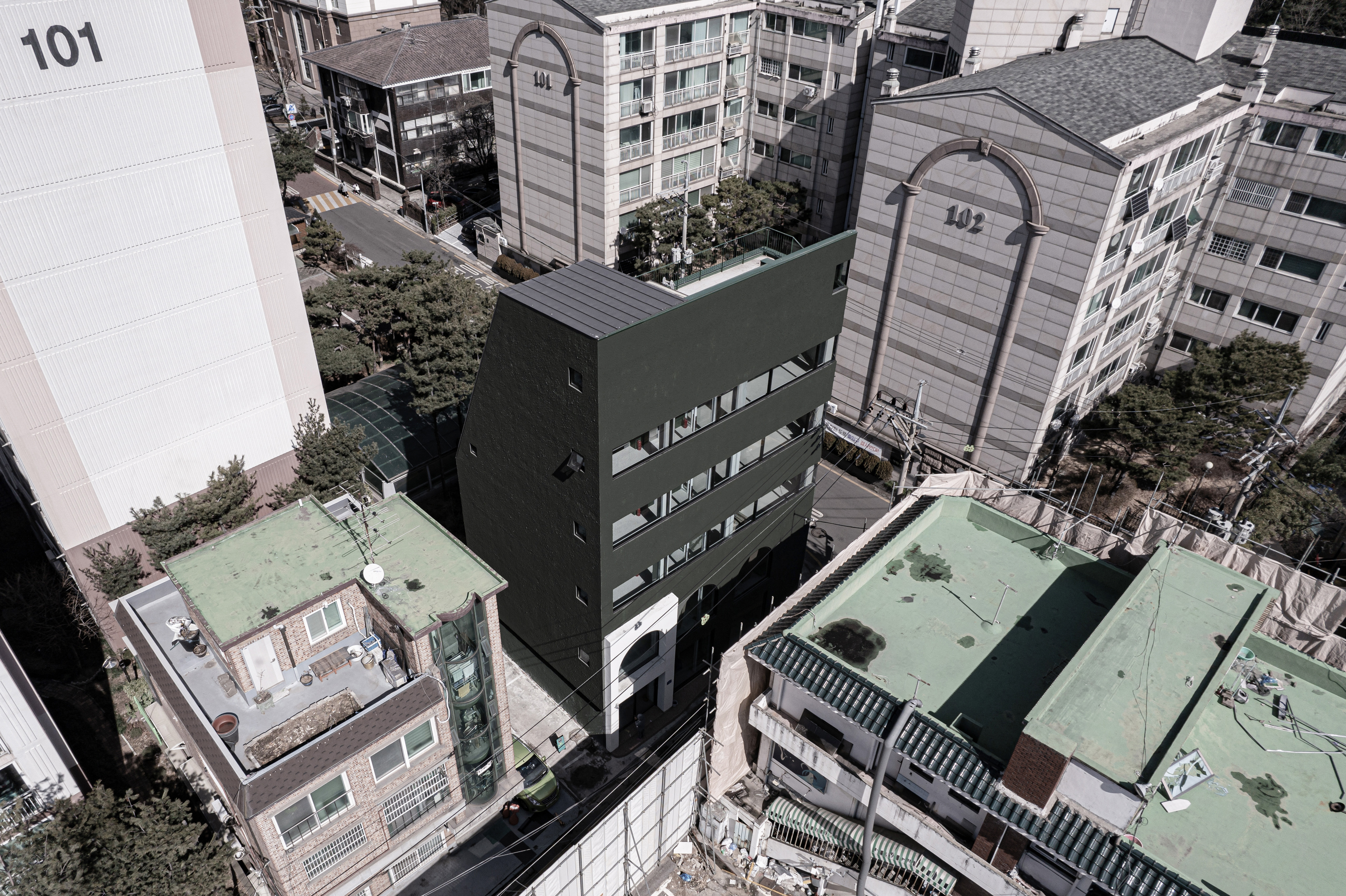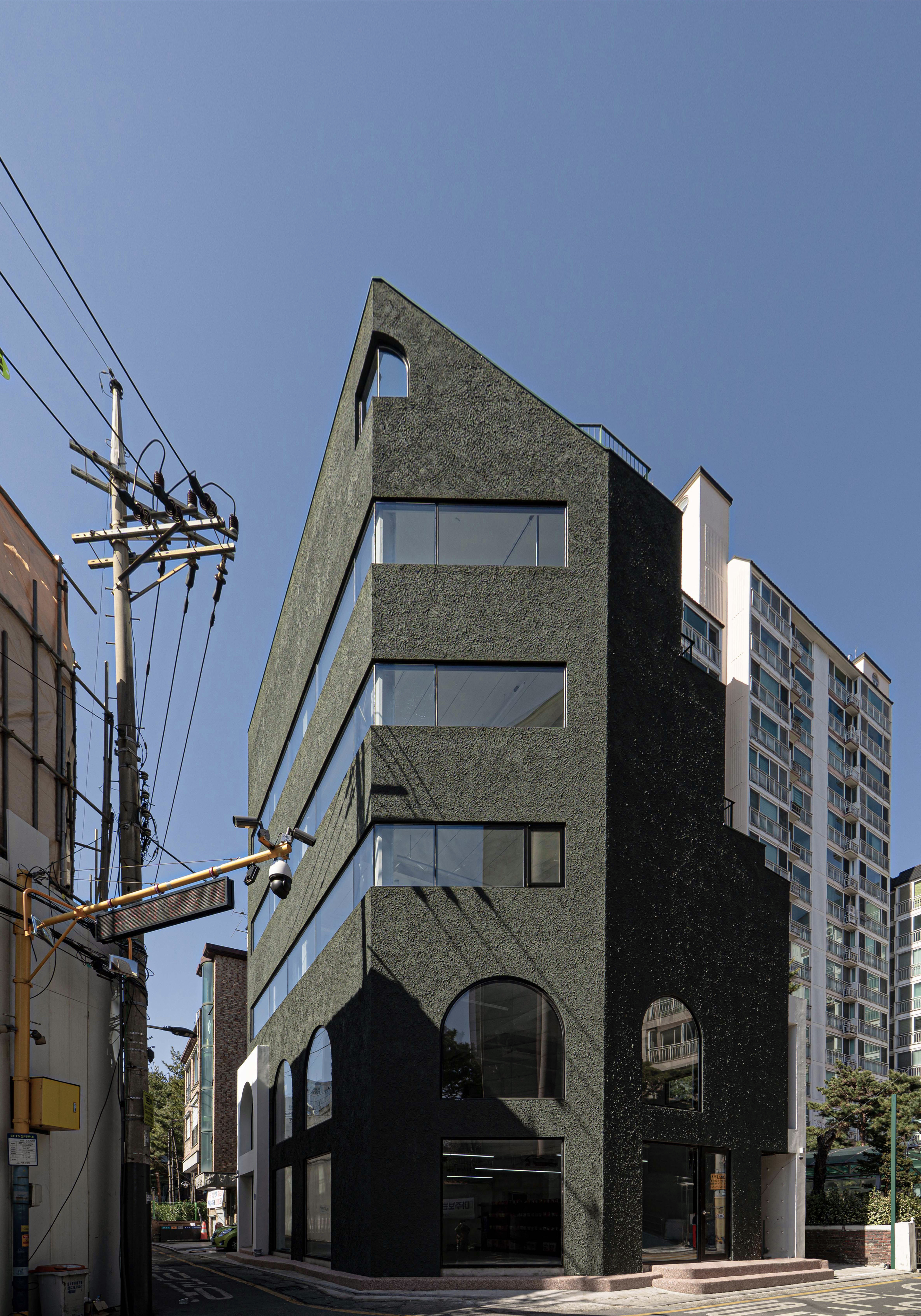 왕복 8차선 이면 도로변에 위치한 대상지는 상가블럭과 주거지 사이에 위치하고 있다. 86년 사용승인을 받은 기존 건물은 주변에서 흔히 볼 수 있는 3층 규모의 상가건물이었다. 건축주는 임대를 위한 상가건물로서 우선 거리에서 확실히 인지가 되는 외관이었으면 했고, 눈에 띄지만 단정한 형태의 건물을 요청했다. 기존 건물을 유지하면서 새로운 인상을 만들 수 있는 백색 알루미늄 펀칭패널을(물결무늬 단면) 제안했으나 예산의 문제로 진행하지 못했다. 다음으로 제안한 재료는 종석미장으로 알루미늄 펀칭패널과는 완전히 다른 물성을 가진 재료다. 매우 거친 마감으로 묵직한 매스감을 잘 표현해 줄 수 있는 재료였다. 색상의 문제로 종석미장과 비슷한 텍스쳐를 갖는 스타코로 최종 결정되었다. 건물 이름에 어울리는 진한 녹색 단일톤의 건물은 아치 형태의 하부 창과 가로로 긴 상부 창의 대조를 통해 거리에서 강한 인상을 갖는 건물이 되었다.
