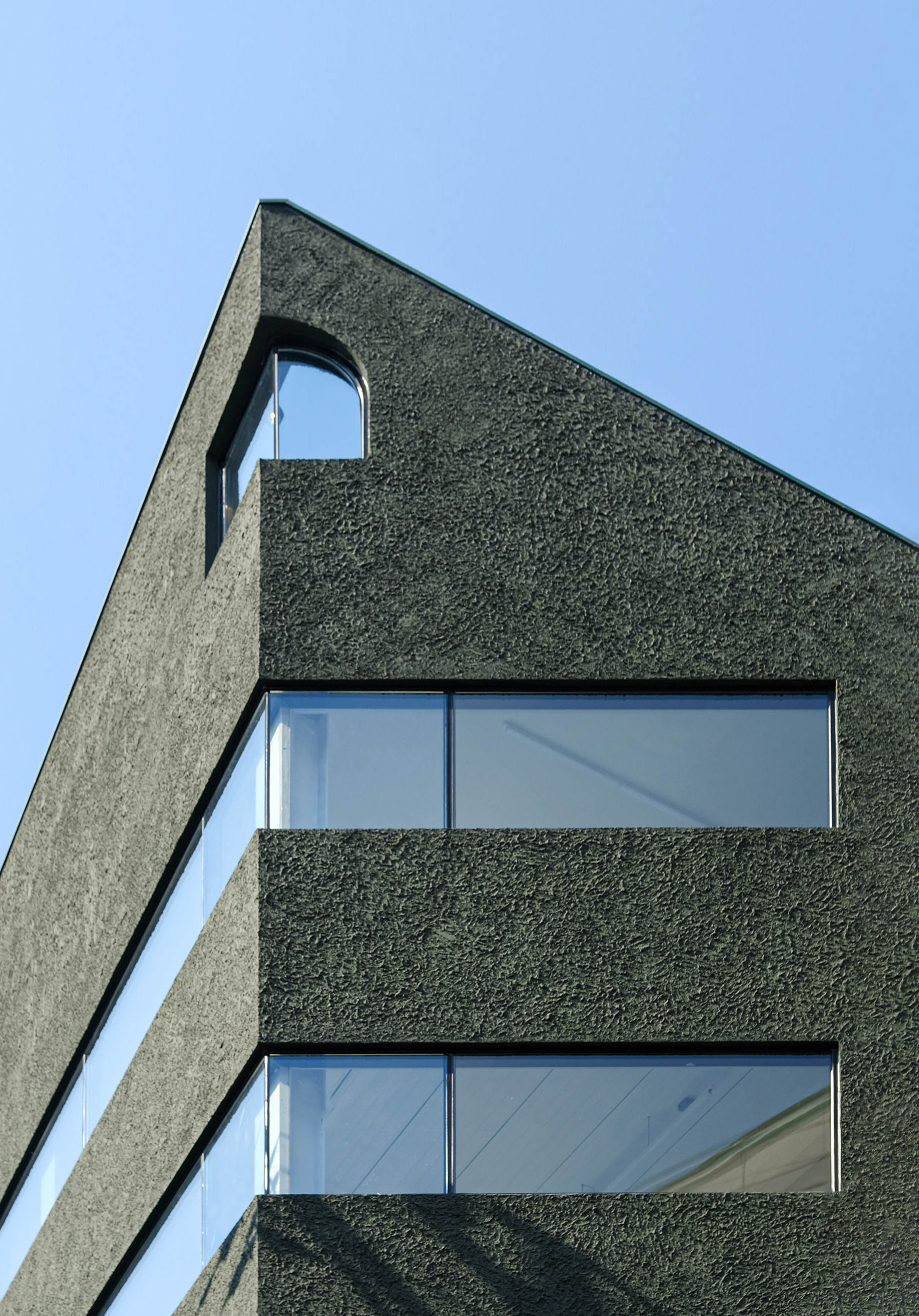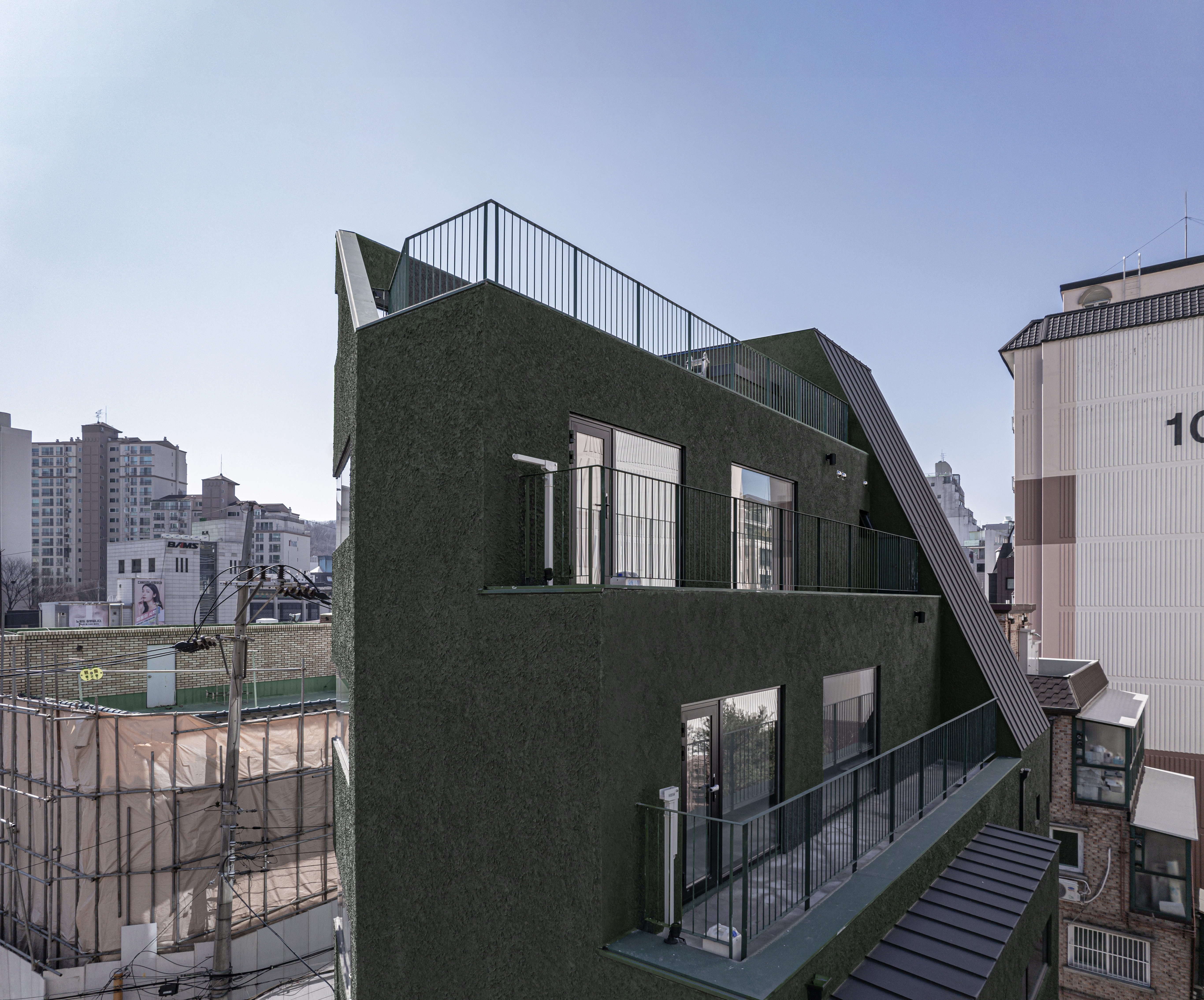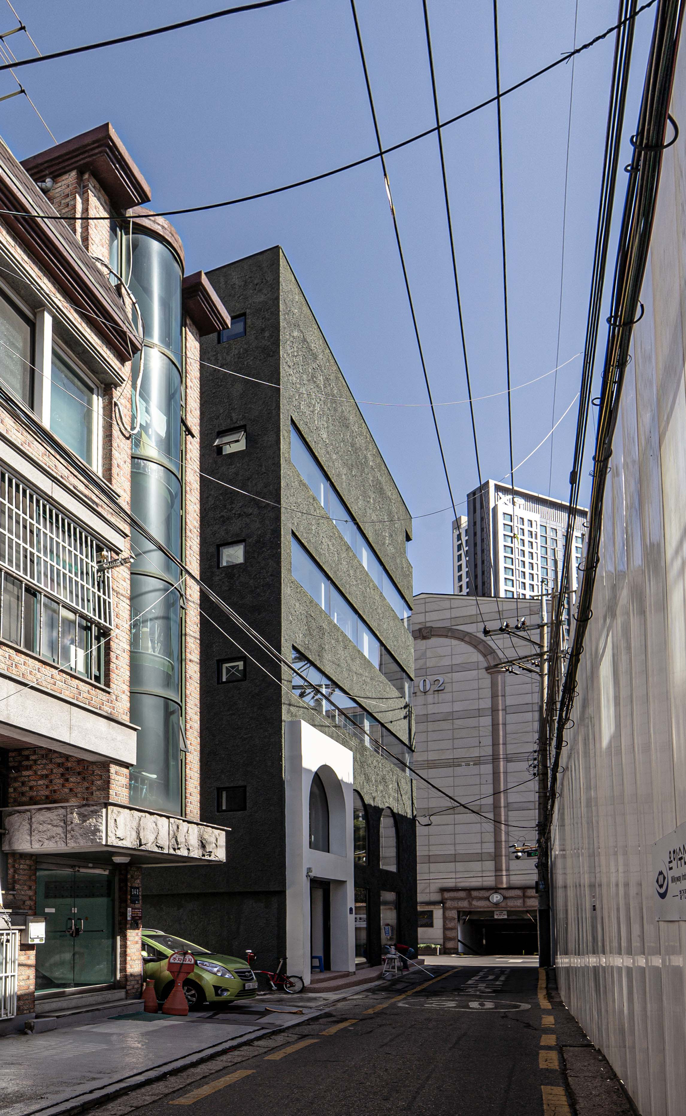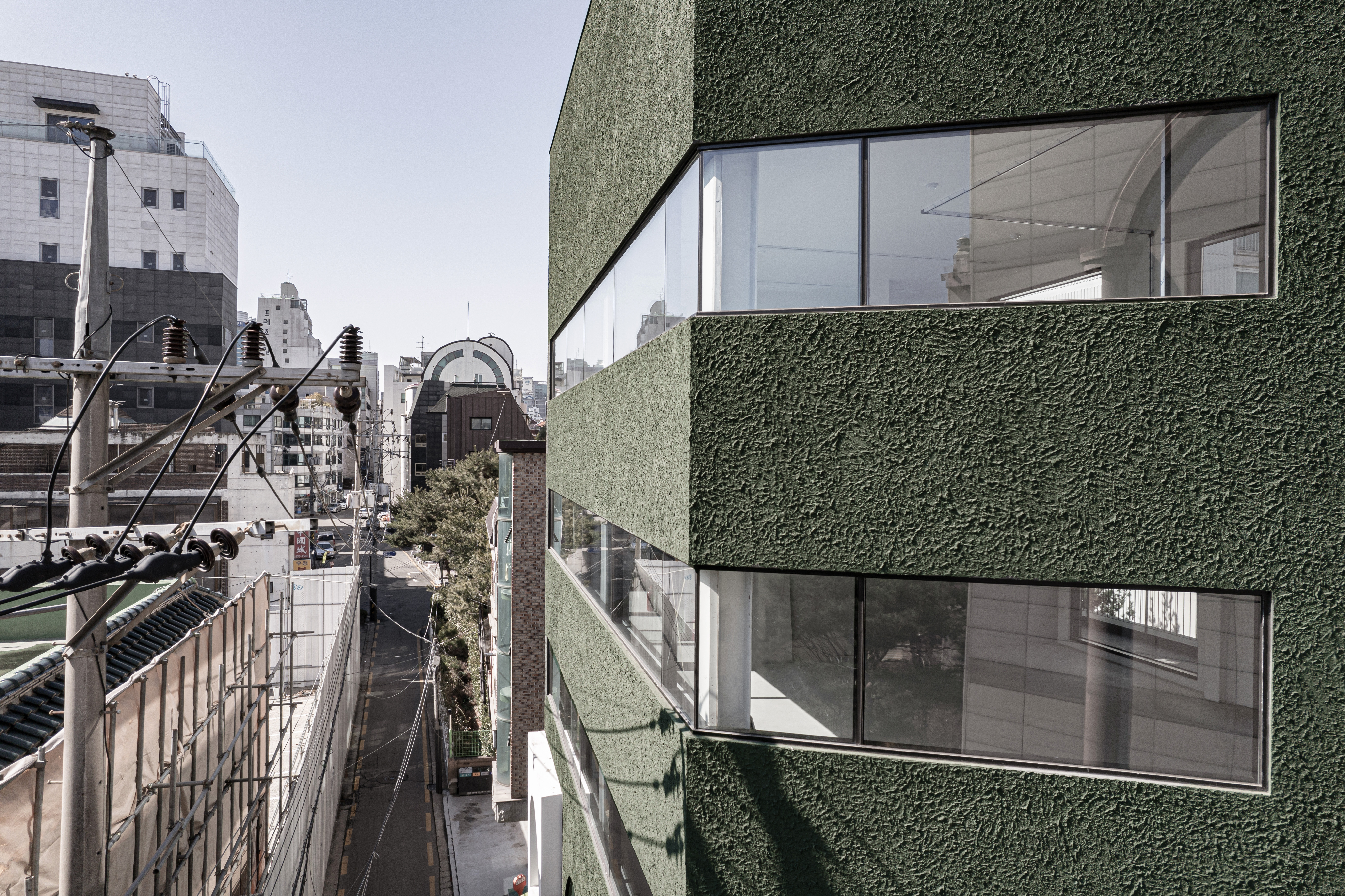 왕복 8차선 이면 도로변에 위치한 대상지는 상가블럭과 주거지 사이에 위치하고 있다. 86년 사용승인을 받은 기존 건물은 주변에서 흔히 볼 수 있는 3층 규모의 상가건물이었다. 건축주는 임대를 위한 상가건물로서 우선 거리에서 확실히 인지가 되는 외관이었으면 했고, 눈에 띄지만 단정한 형태의 건물을 요청했다. 기존 건물을 유지하면서 새로운 인상을 만들 수 있는 백색 알루미늄 펀칭패널을(물결무늬 단면) 제안했으나 예산의 문제로 진행하지 못했다. 다음으로 제안한 재료는 종석미장으로 알루미늄 펀칭패널과는 완전히 다른 물성을 가진 재료다. 매우 거친 마감으로 묵직한 매스감을 잘 표현해 줄 수 있는 재료였다. 색상의 문제로 종석미장과 비슷한 텍스쳐를 갖는 스타코로 최종 결정되었다. 건물 이름에 어울리는 진한 녹색 단일톤의 건물은 아치 형태의 하부 창과 가로로 긴 상부 창의 대조를 통해 거리에서 강한 인상을 갖는 건물이 되었다.