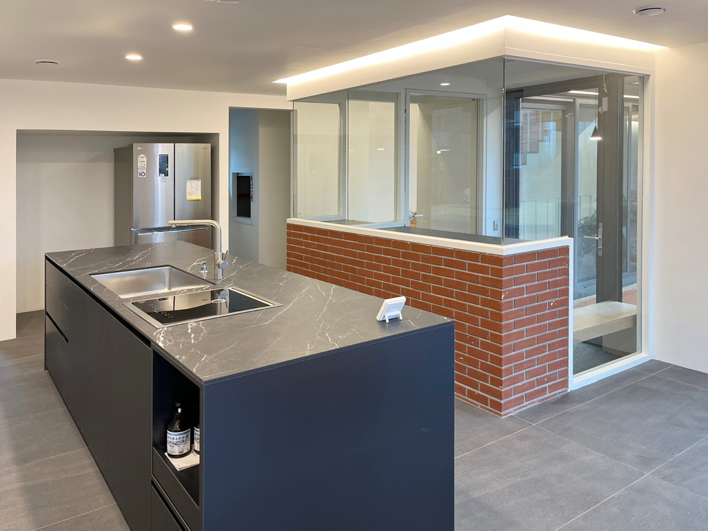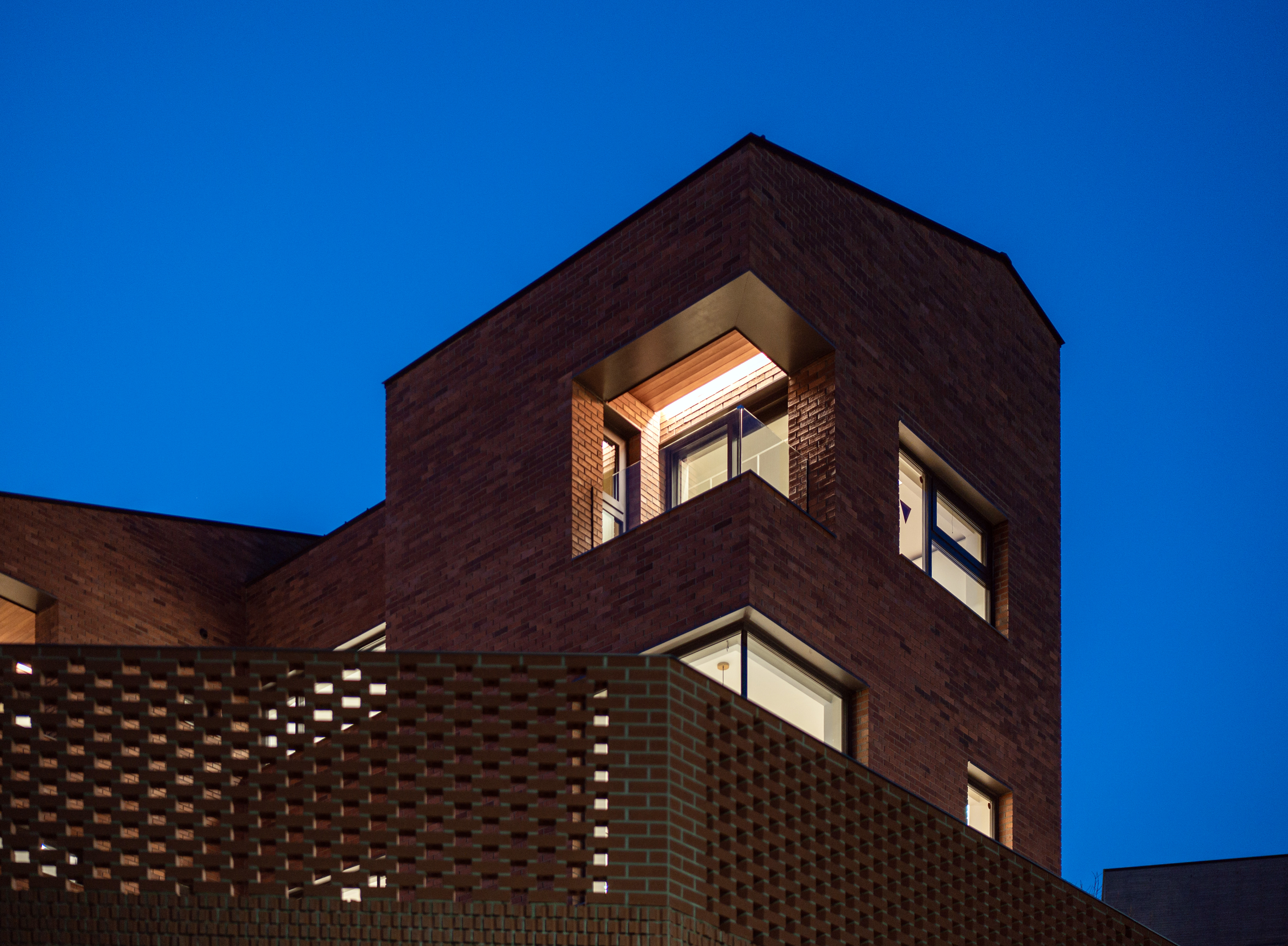 교차로에 위치한 대상지는 3미터 이상의 높이 차이가 있는 땅으로 지하층에 형성된 주차장과 선큰 마당의 외벽면이 주 입면으로서 가로에 나타나게 된다. 집을 처음으로 마주하게 되는 중요한 벽면으로 반모쌓기와 영롱쌓기를 통해 만들어진 벽면은 시간에 따라 빛과 그림자가 다양한 입면을 만들어낸다. 차고문과 대문을 경계로 하부는 진한 회색의 스타코로 마감하여 차분하면서도 단단한 외벽 분위기를 구성하고자 하였다.